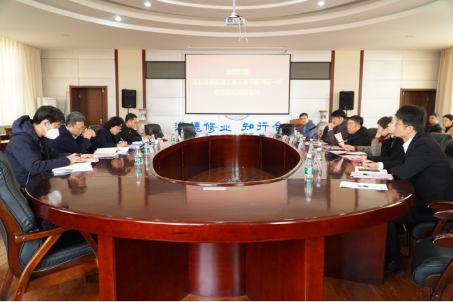 2月23日上午,河北省委教育工委副书记、省教育厅党组成员王俊华、省教育厅党建处处长宋吉国,沧州市委教育工委副书记代砚广、党建科科长蔡昶军一行莅临米乐官网调研指导党建工作。渤海新区黄骅市副市长张桂云,祥兴集团副总裁薛君南,米乐官网党委副书记、常务副校长张长铎,财务总监兼总会计师余裕玲,副校长赵金楼、邵晓康,副书记吴立军共同参加本次党建工作调研。