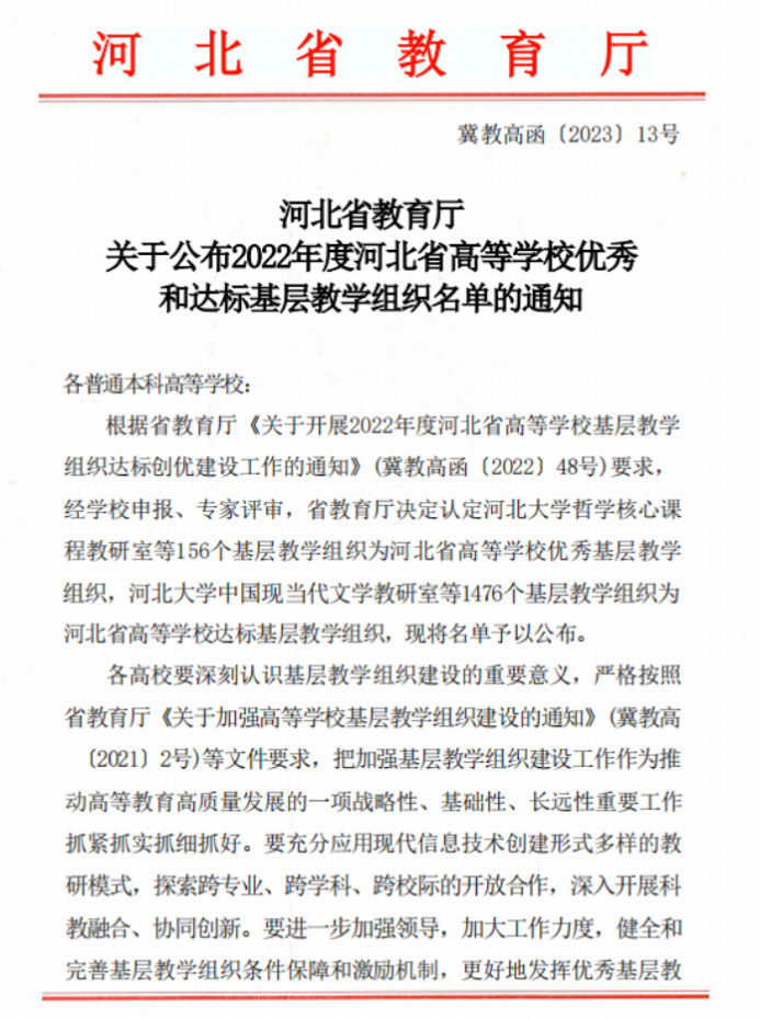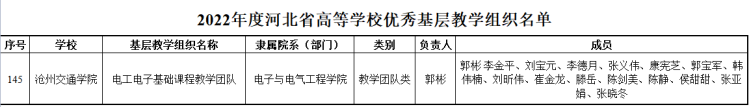 近日,河北省教育厅公布了2022年度河北省高等学校优秀和达标基层教学组织的名单,米乐官网电工电子基础课程教学团队被认定为优秀基层教学组织,工商管理专业教研室等17个基层教学组被认定为达标基层教学组织。