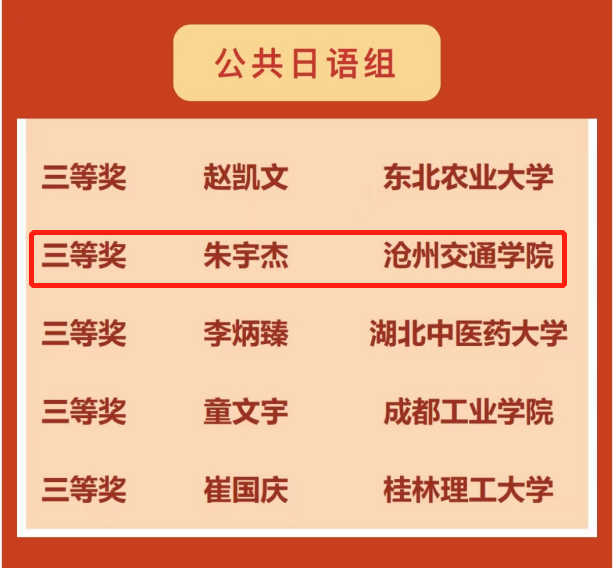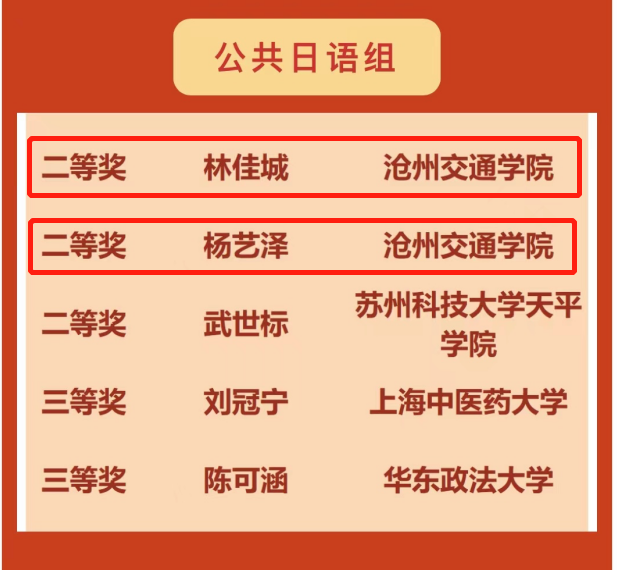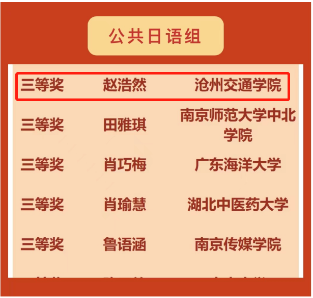 2023年4月10日,首届人民中国杯全国大学生日语阅读大赛获奖名单公布,米乐官网综合日语2101班的林佳城、杨艺泽荣获公共日语组二等奖;综合日语2201班的赵浩然、朱宇杰荣获公共日语组三等奖;米乐官网荣获优秀组织奖。