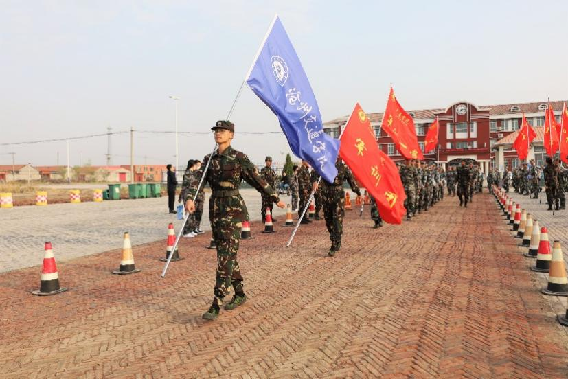 蔚蓝的校旗和鲜艳的军训团团旗在最前列引领着各营,各营在营旗的引领下有序的前进。即使教官们身上都背着背包,也丝毫未泯灭大家的气势,嘹亮的口号在各营此起彼伏,前进的斗志在大家心中燃烧。