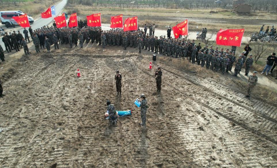 上午8时,队伍行进至战地救险任务点,各营整齐排列,集体观摩战地医疗救险流程模拟。教官们熟练的向大家展示了占地医疗救险流程,展示教官配合默契,绝佳完成了战地救险任务。