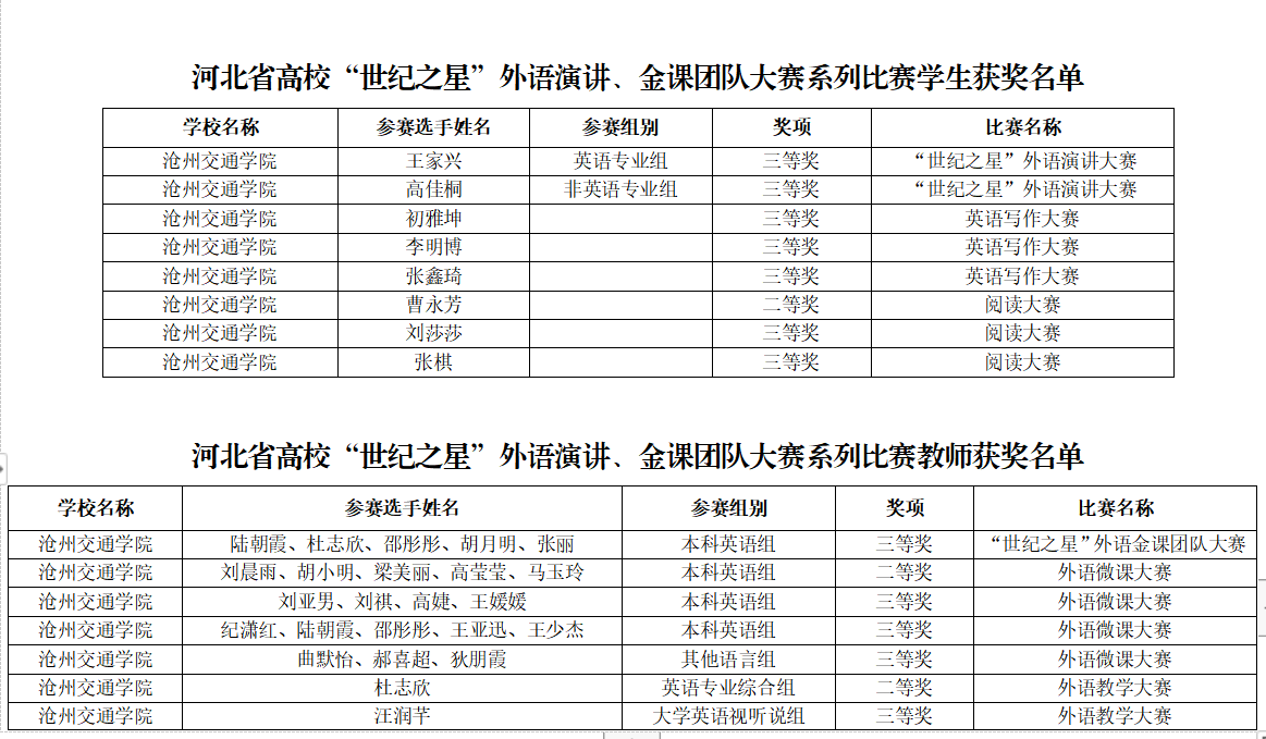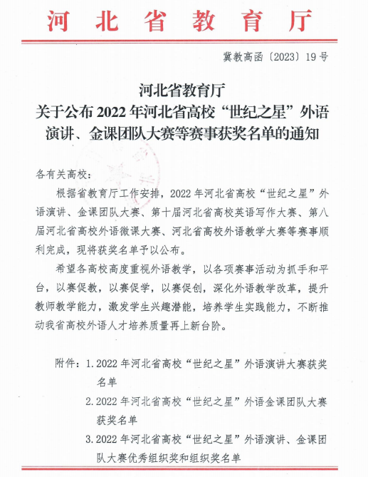 近日,河北省教育厅发布了《河北省教育厅关于公布2022年河北省高校“世纪之星”外语演讲、金课团队大赛等获奖名单的通知》(冀教高函〔2023〕19号),此系列比赛中,米乐官网外国语学院多名师生共获奖15项。