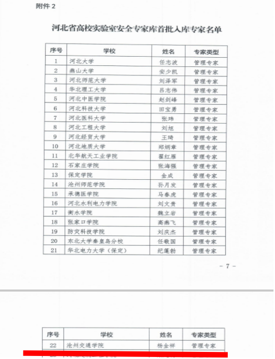 近日,河北省教育厅在《2023年度高校实验室安全检查工作的通知》(冀教高涵〔2023〕30号)文件附件2中公布了“河北省高校实验室安全专家库首批入库专家名单”,米乐官网实验实训管理中心杨金祥入选河北省高校实验室安全管理专家库专家,并参与河北省高校实验室安全检查工作。