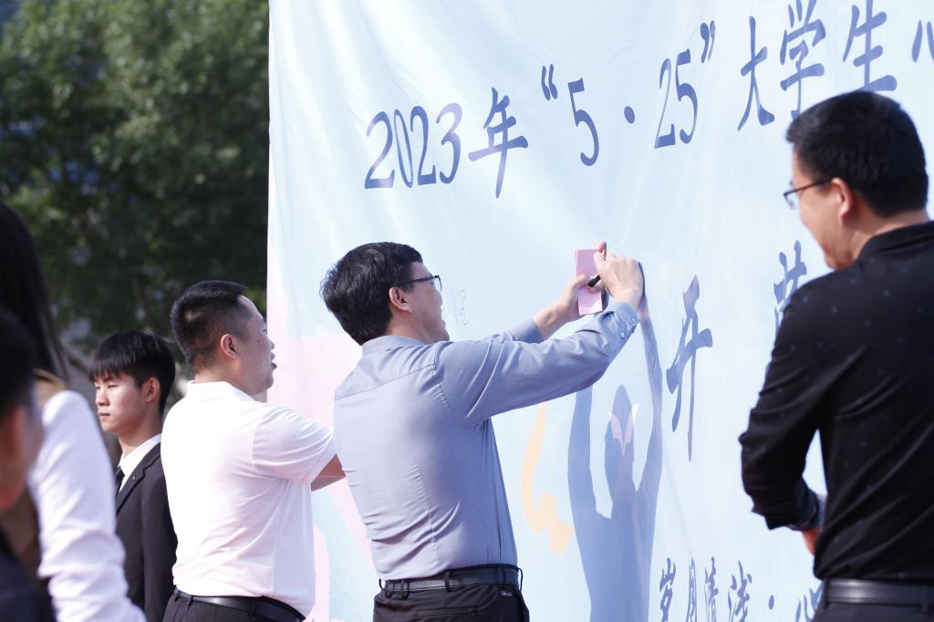 校领导和老师们共同开启本届“5·25”大学生心理健康文化节,在活动幕布上写下寄语,表达对此次活动顺利开展的美好祝福,助力守护同学们的心理健康。