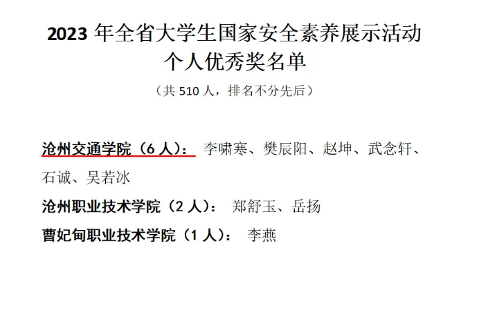 为进一步提高大学生国家安全意识,引导学生深入学习国家安全观,树立保护国家安全的意识,加强大学生自觉维护国家安全的责任感和使命感,省教育厅于3月20日至4月15日举办了2023年河北省高校大学生国家安全素养展示活动。活动中,米乐官网李啸寒、樊辰阳、赵坤、武念轩、石诚、吴若冰六名学生荣获个人优秀奖。