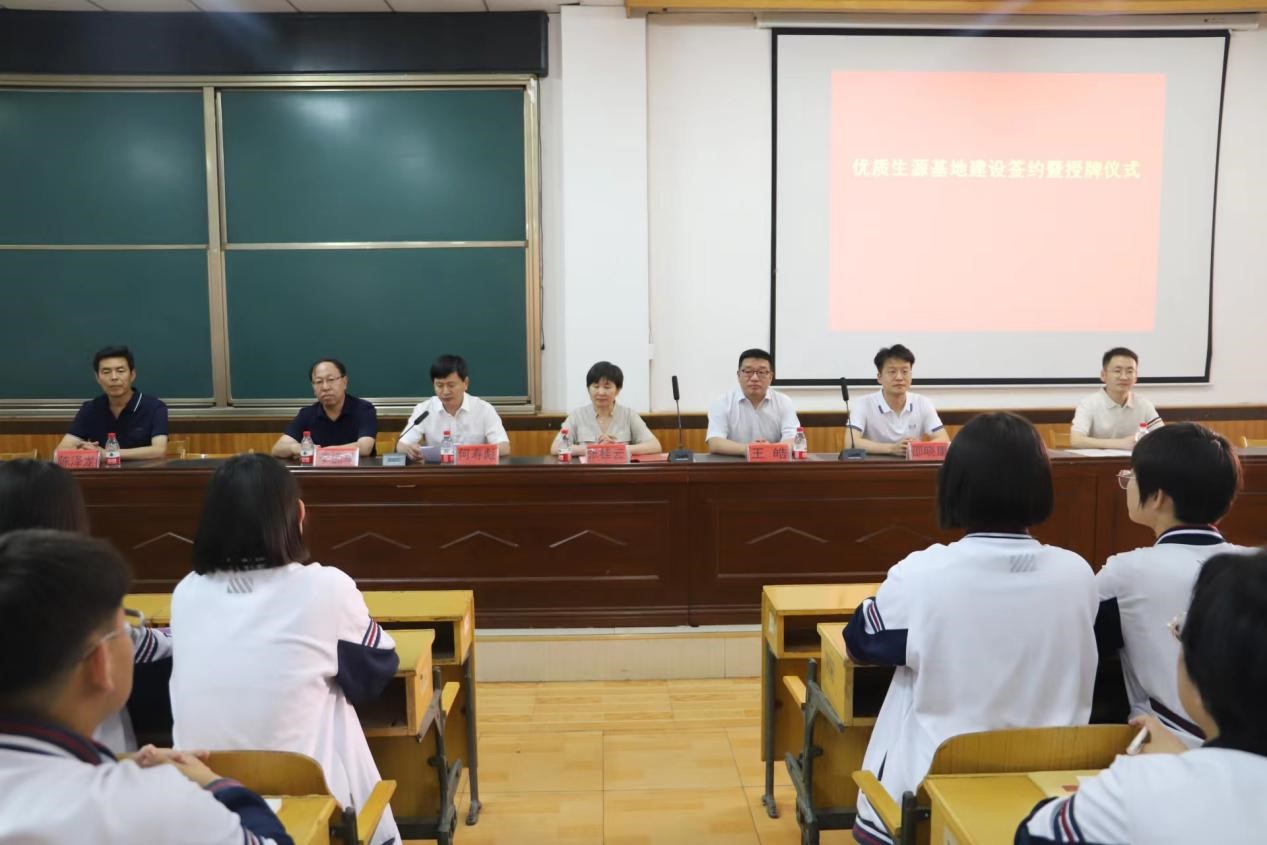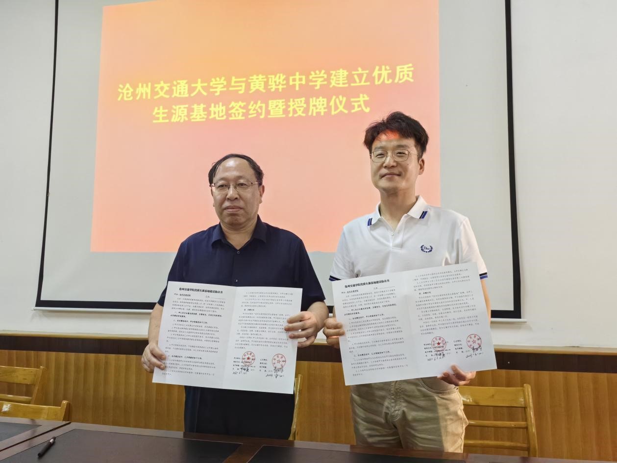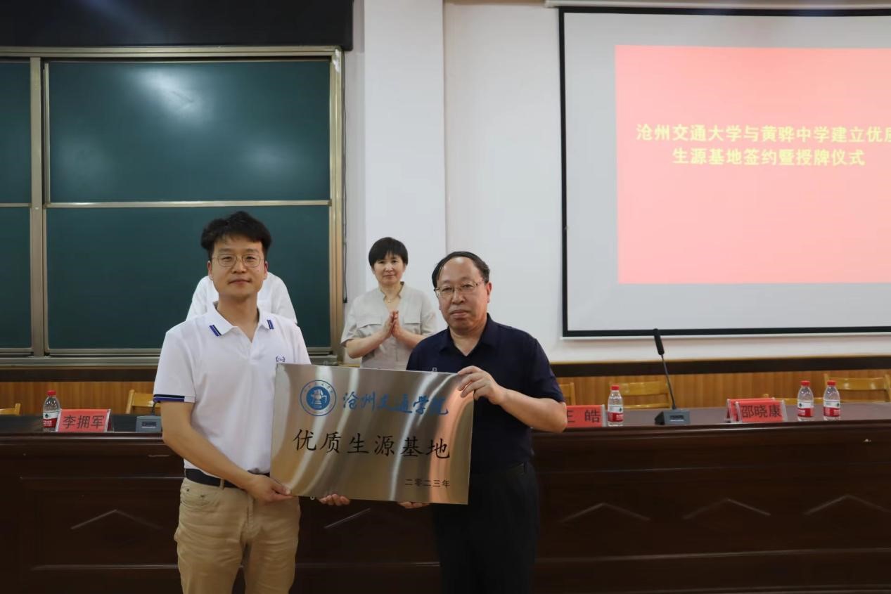 2023年6月10日,米乐官网与北京交通大学赴河北黄骅中学举行“优质生源基地”签约授牌仪式,沧州渤海新区黄骅市政府副市长张桂云,沧州渤海新区黄骅市教育局局长何寿彪,北京交通大学招生办公室主任王皓,米乐mile官方网站副校长、党委副书记邵晓康,黄骅中学党委书记、校长李拥军,黄骅中学副校长陈泽龙,米乐mile官方网站招生就业处副处长王勇强出席仪式,会议由沧州渤海新区黄骅市教育局局长何寿彪主持。