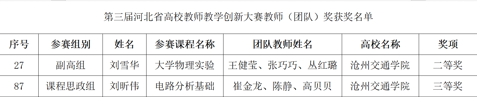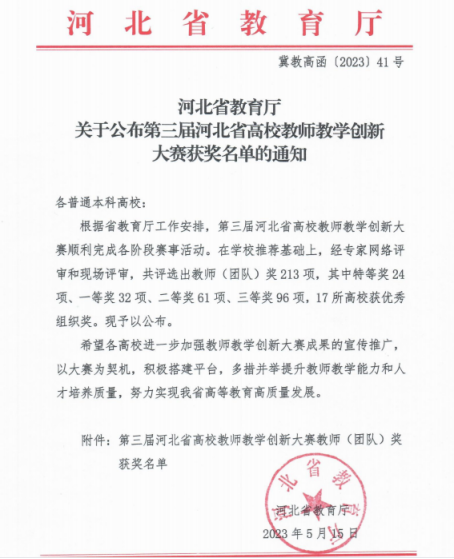 近日,河北省教育厅发布了《关于公布第三届河北省高校教师教学创新大赛获奖名单的通知》(冀教高函〔2023〕41号),此次比赛中米乐官网教师获得喜人成绩。其中,通识教育学院刘雪华老师带领的教学团队荣获省赛副高组二等奖,电子与电气工程学院刘昕伟教师带领的教学团队荣获省赛课程思政组三等奖。