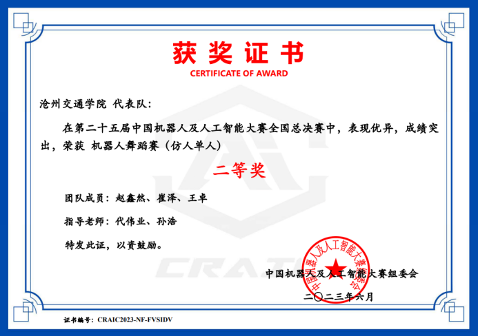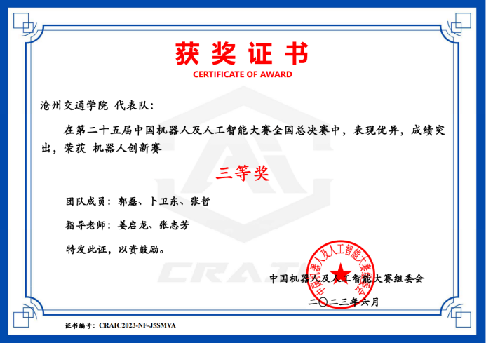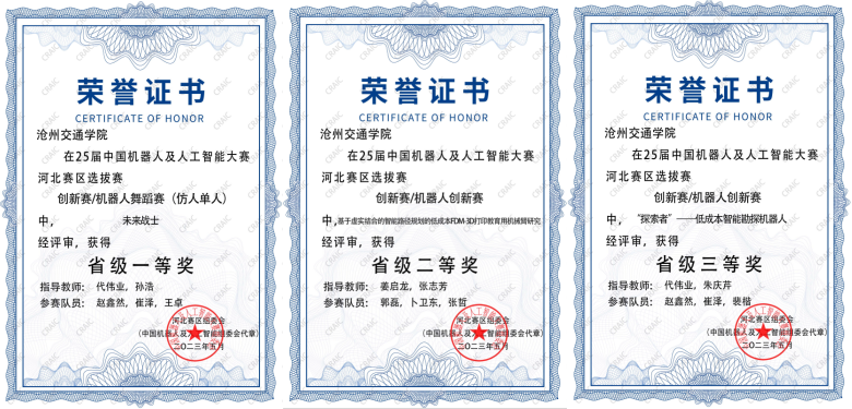 在5月25日与5月27日举行的25届中国机器人及人工智能大赛河北赛区选拔赛与全国初评中,米乐官网派出三支队伍参赛,分别荣获省级一等奖、二等奖与三等奖,其中获评省级一等奖与省级二等奖的两支队伍在国赛中分别获得全国二等奖与全国三等奖,实现了米乐官网在该赛事上的新突破。