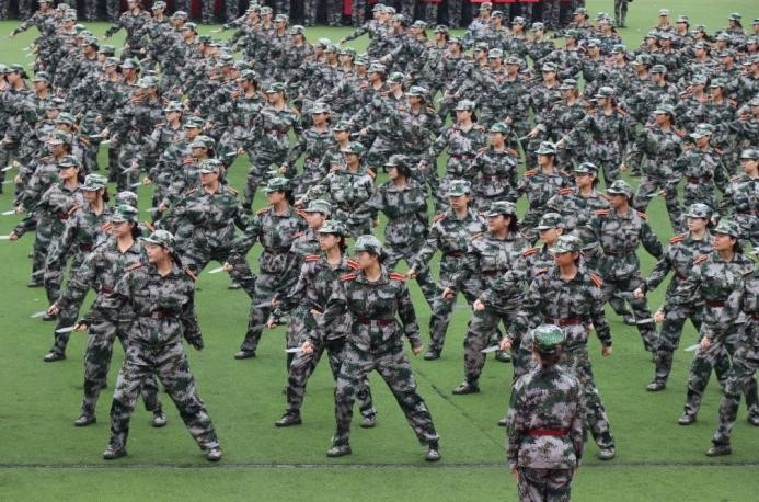 英姿飒爽,神采飞扬。她们的口号声铿锵有力,每一个动作都干脆流畅。看,匕首生风,汗水挥洒;一突一刺,一防一击,杀声震天,豪情万丈,尽显巾帼不让须眉之姿。