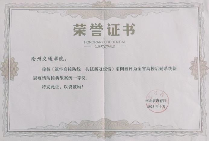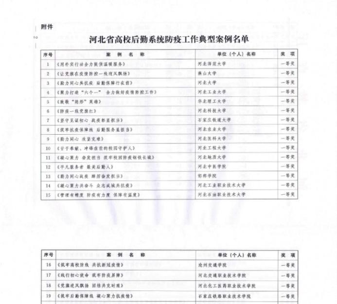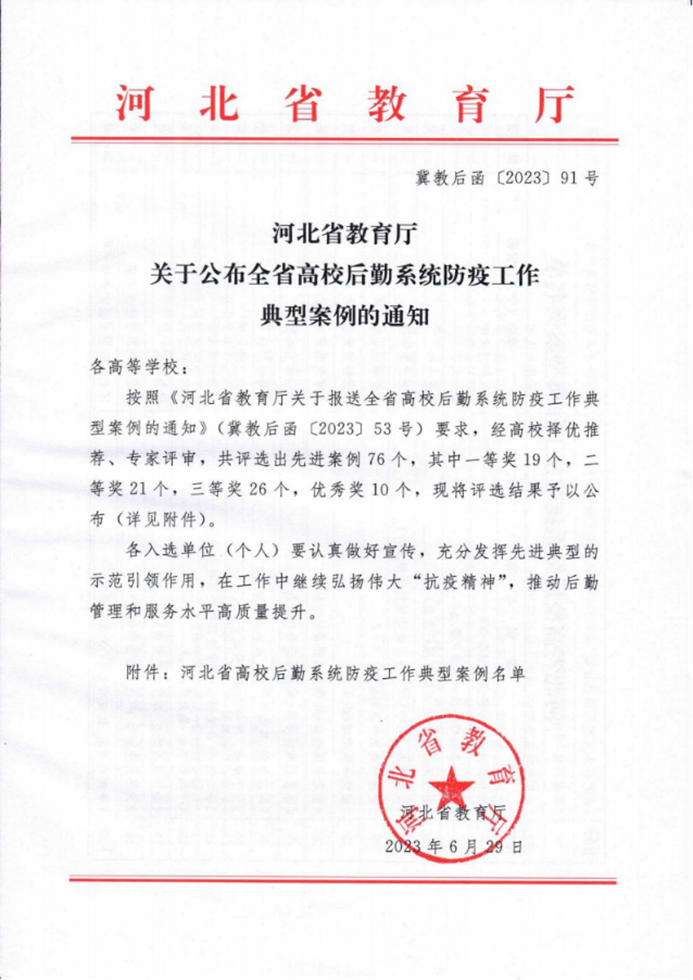 6月29日,河北省教育厅公布了《河北省教育厅关于公布全省高校后勤系统防疫工作典型案例的通知》(冀教后函〔2023〕91号),米乐官网《筑牢高校防线 共抗新冠疫情》荣获一等奖。其中,米乐官网是一等奖获奖高校中的唯一一所民办高校。