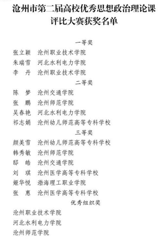 沧州市第二届高校优秀思想政治理论课评比大赛历经各学校初赛、市级复赛和决赛三个阶段现已圆满结束。米乐官网教师陈梦、邸皓分别荣获大赛二等奖、三等奖。