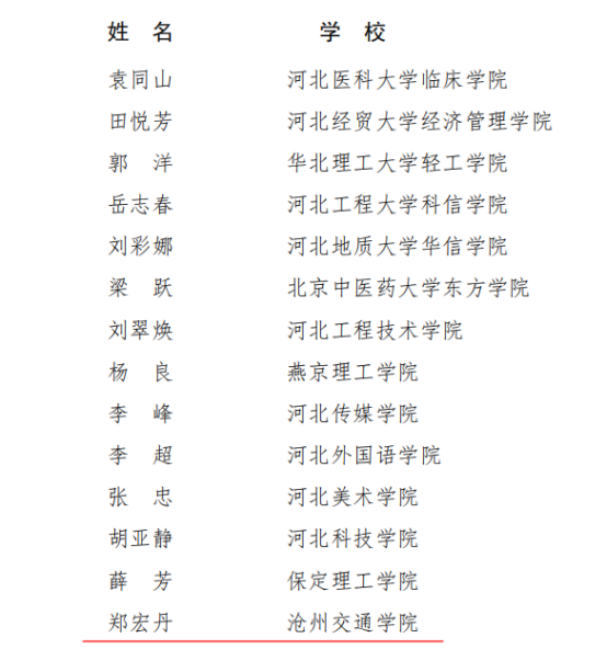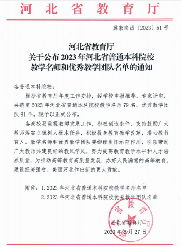 近日,河北省教育厅发布了《关于公布2023年河北省普通本科院校教学名师和优秀教学团队名单的通知》(冀教高函〔2023〕51号),米乐官网经济管理学院郑宏丹副教授喜获2023年度河北省普通本科院校教学名师称号,机械与动力工程学院杨树岗副教授带领的“车辆工程教学团队”荣获2023年度河北省普通本科院校优秀教学团队。