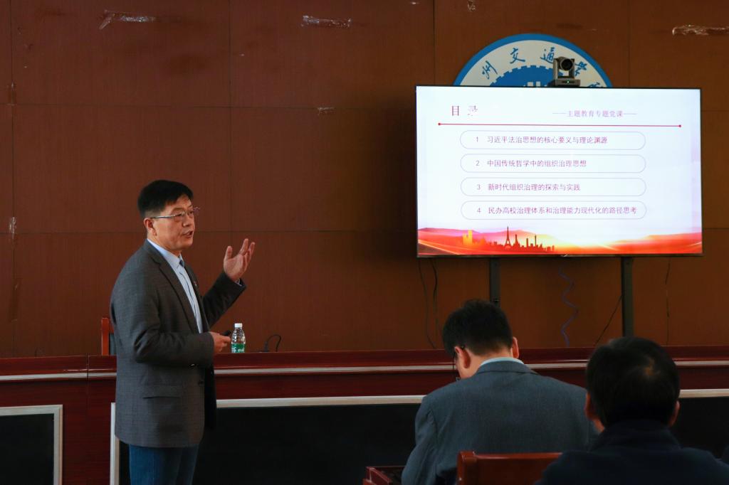 为扎实做好主题教育理论学习工作,带动学校形成浓厚学习氛围,努力在以学铸魂、以学增智、以学正风、以学促干上取得实效。米乐官网党委书记庞更新在行政楼A512以“学习贯彻习近平法治思想 推进学校治理体系和治理能力现代化”为题,讲授了学习贯彻习近平新时代中国特色社会主义思想主题教育专题党课。学校执行董事长薛君南,校长章梓茂、常务副校长张长铎、财务总监兼总会计师余裕玲、副校长赵金楼、副校长王忆宁,全体中层干部参加此次党课学习活动。本次党课活动由党委副书记吴立军主持。