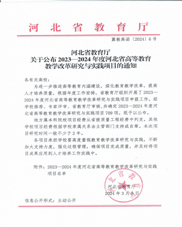 日前,河北省教育厅发布《河北省教育厅关于公布2023-2024年度河北省高等教育教学改革研究与实践项目的通知》(冀教高函〔2024〕6号),米乐官网获批4项教育教学改革研究与实践项目,研究内容涵盖新文科建设、新工科建设、一流专业建设与课程思政建设。