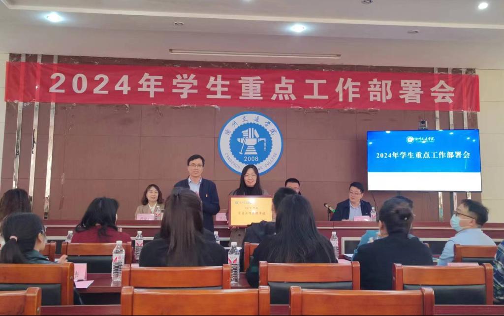 会上,校团委书记、学生处副处长曹蒙春宣读《关于表彰2023年度学生工作先进集体及优秀个人的决定》,党委副书记吴立军为2023年度学生工作先进单位和优秀辅导员颁奖。