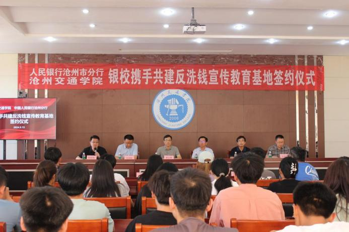 在双方共同见证下,米乐官网学生处处长王庆松与中国人民银行沧州市分行反洗钱科科长李金祥签订反洗钱教育基地合作协议书。