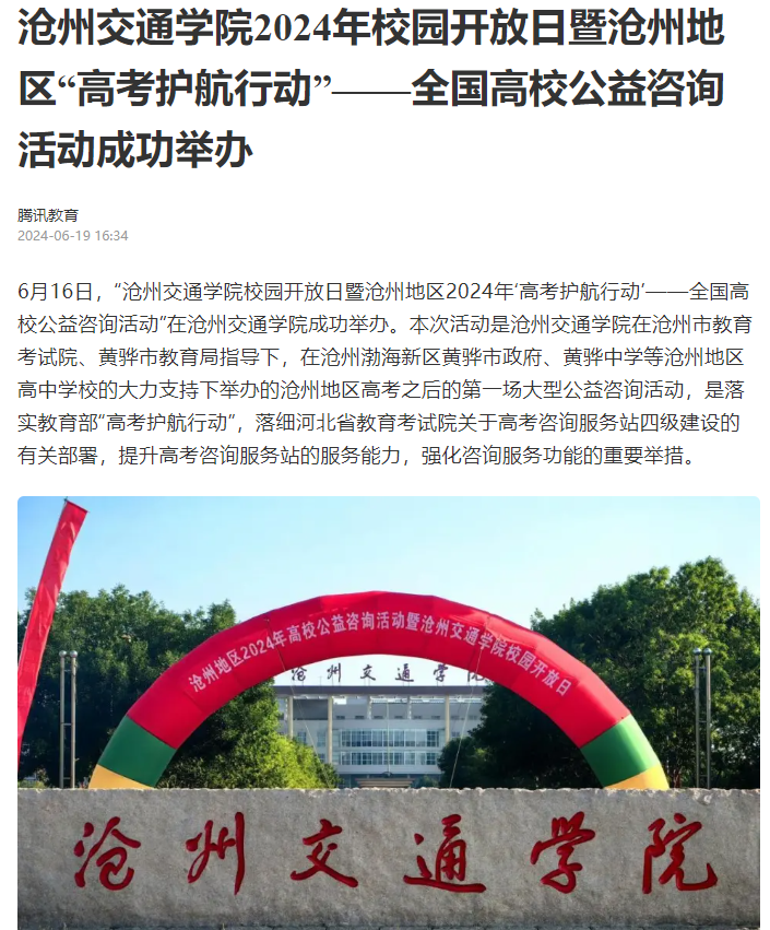 近日,河北卫视《你好京津冀》、河北公共频道《新闻6号线》、腾讯教育、中国教育在线、凤凰教育等主流媒体报道米乐官网2024年校园开放日暨沧州地区全国高校公益咨询活动。