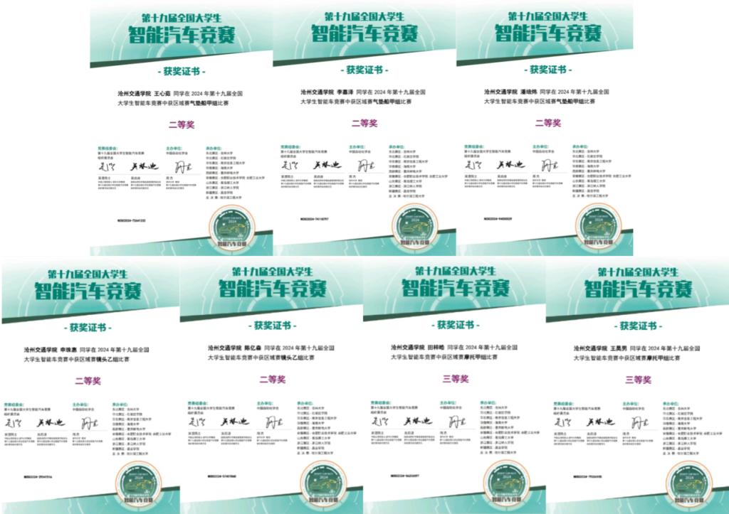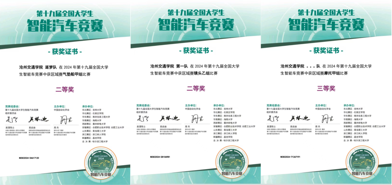 此次大赛自动化2302李嘉泽、自动化2301潘培炜、自动化2306王心茹三位同学荣获华北赛区气垫组二等奖;人工智能2201陈亿森、人工智能2301申珠惠两位同学荣获华北赛区镜头组二等奖;电气2212田梓皓、信号2205王昊男两位同学荣获华北赛区摩托组三等奖。