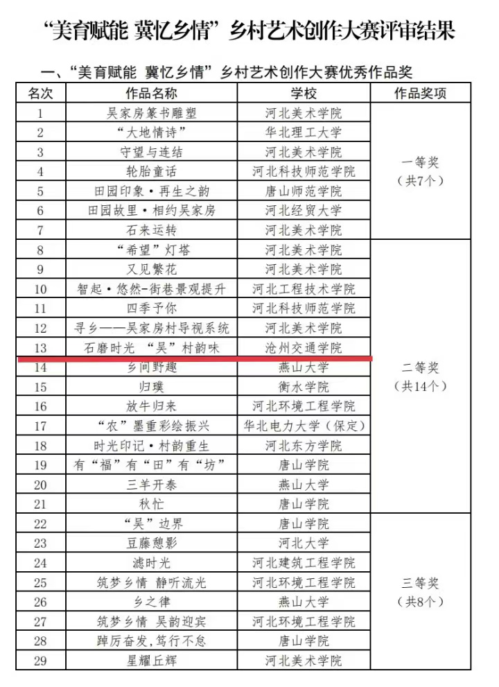 9月12日-15日,艺术学院副院长刘展辰,艺术学院教师齐瑞璇、王一伦带领数名艺术学院学子,参与了由河北省教育厅、河北省文化和旅游厅、河北省农业农村厅主办,秦皇岛市海港区杜庄镇吴家房村村委会承办,秦皇岛市教育局、秦皇岛市旅游和文化广电局、秦皇岛市农业农村局、中仁城市运营服务(石家庄)有限公司协办的“美育赋能,冀忆乡情”活动,以“石磨时光‘吴’村韵味”为主题创作作品,荣获乡村艺术创作大赛二等奖。