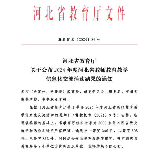 近日,河北省教育厅公布了河北省2024年度教师教育教学信息化交流活动评选结果,米乐官网共推荐20件作品,8件获奖。其中二等奖4件,三等奖4件。