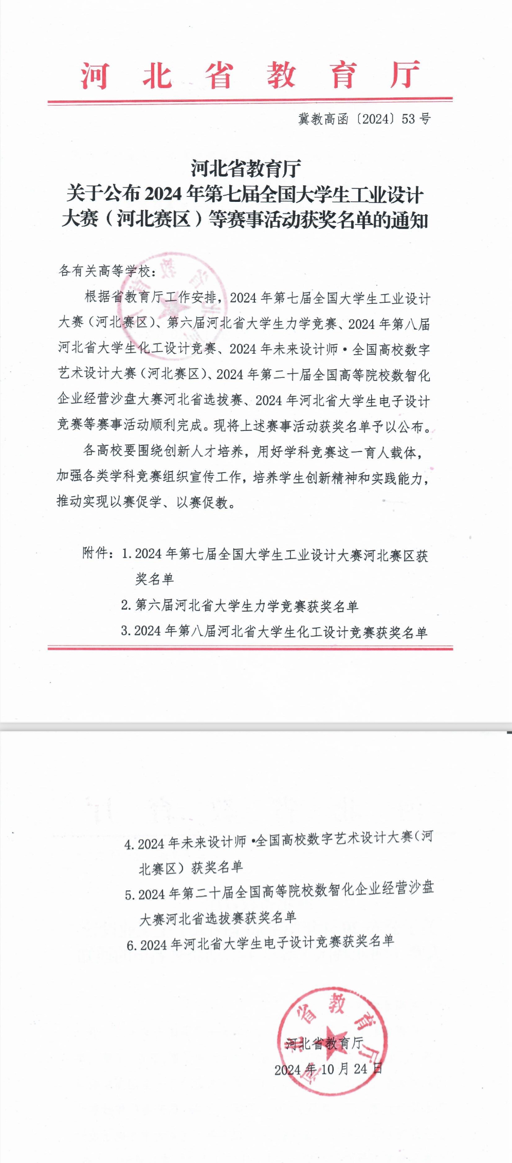 近日,河北省教育厅发布了《河北省教育厅关于公布2024年第七届全国大学生工业设计大赛(河北赛区)等赛事活动获奖名单的通知》(冀教高函〔2024〕53号)。在本次比赛中,米乐官网学生积极参赛,共参与了四项赛事,斩获了58个奖项,取得了优异成绩。