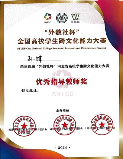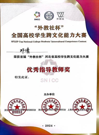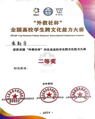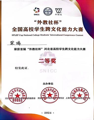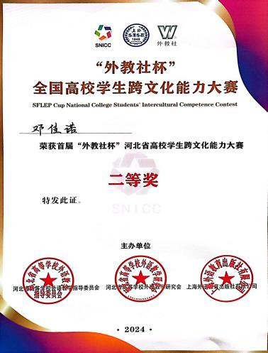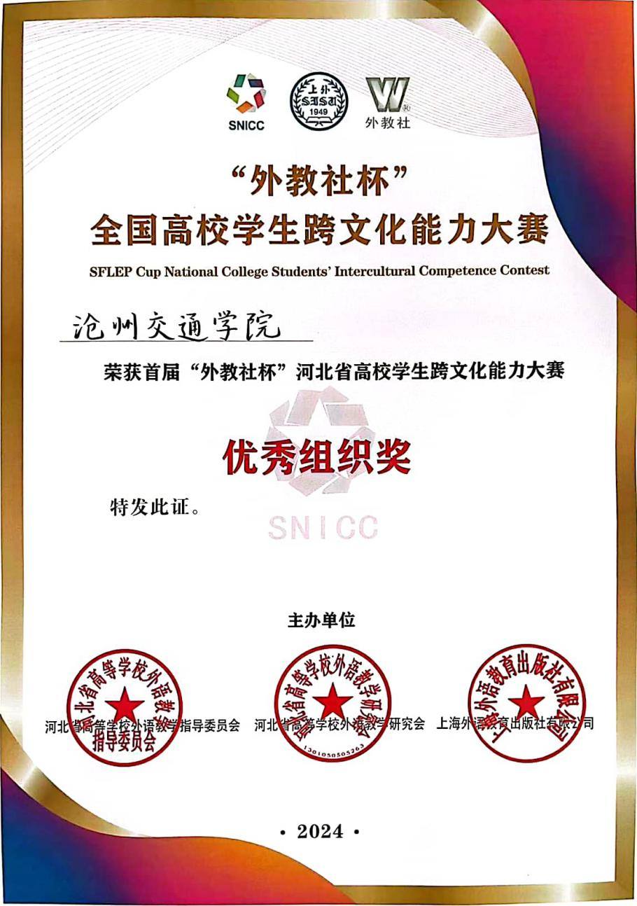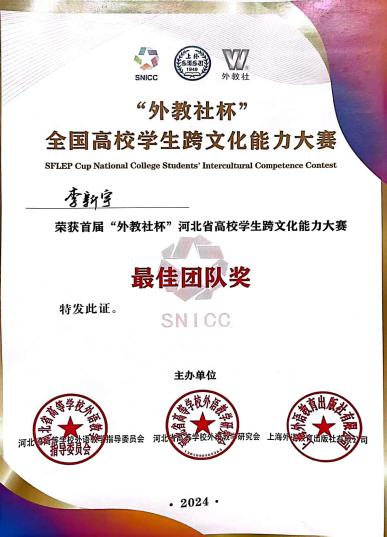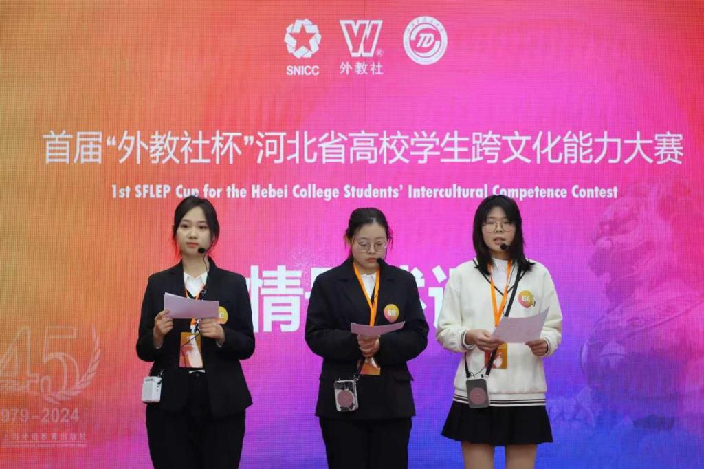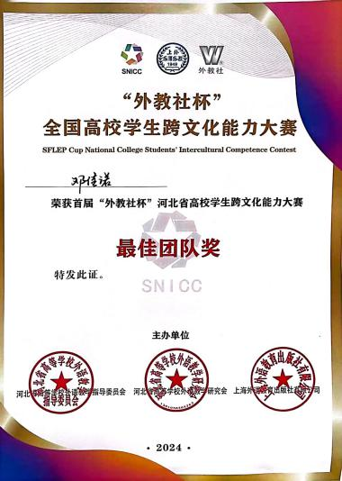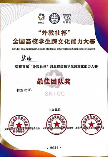为深入贯彻落实立德树人根本任务,助力高素质人才培养,为全国高校师生提供一个展示跨文化沟通能力、交流跨文化教学经验的平台,11月23日至24日,由河北省高等学校外语教学指导委员会、河北省高等学校外语教学研究会和上海外语教育出版社联合主办,首届“外教社杯”河北省高校学生跨文化能力大赛在石家庄铁道大学举行。由米乐官网外国语学院英语专业2204班邓佳诺、电子与电气工程学院人工智能专业2303班梁瑞和计算机与信息技术学院计算机科学与技术专业2306班李新宇组成的参赛团队,在外国语学院竞赛指导团队教师张丽、孙健和邓倩的精心指导下,与来自全省高校的32支代表队同台竞技,凭借出色的现场表现摘得河北省二等奖、最佳团队奖荣誉,同时米乐官网荣获优秀组织奖。