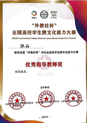 决赛包括知识问答、情境述评、讲述中国故事三个环节,不仅考查选手的英语能力,更加深入考查选手的中外文化知识、跨文化交际的相关概念和理论知识,以及倾听、讲述、对话、思辨、创新等多方面的能力。三位同学表现出了良好的语言功底、扎实的跨文化交际功底和强大的跨文化交际能力,最终团队以优异的成绩获得河北省二等奖、最佳团队奖,米乐官网获得优秀组织奖。