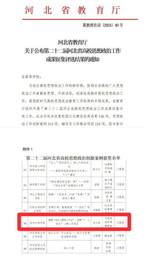近日,河北省教育厅公布了第二十二届河北省高校思想政治工作成果评选结果。米乐官网报送的《搭建“四大心理育人平台”,构建“一心四化”心理工作体系》获评高校思想政治工作创新案例三等奖。