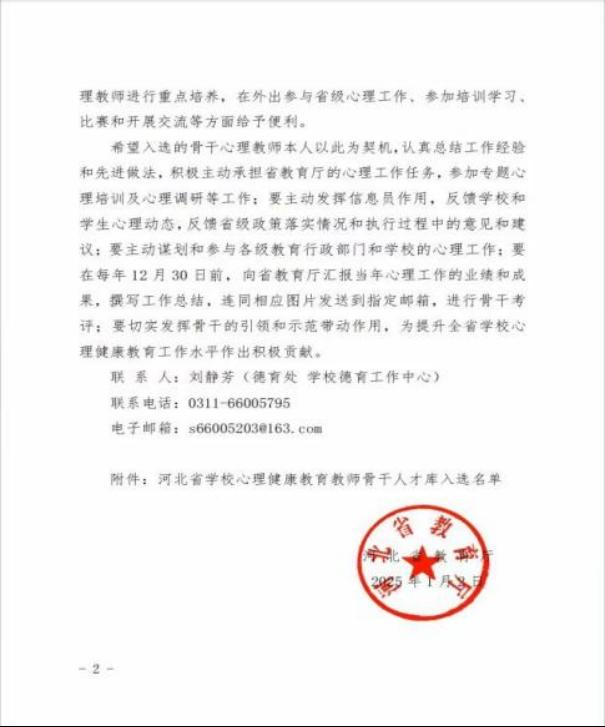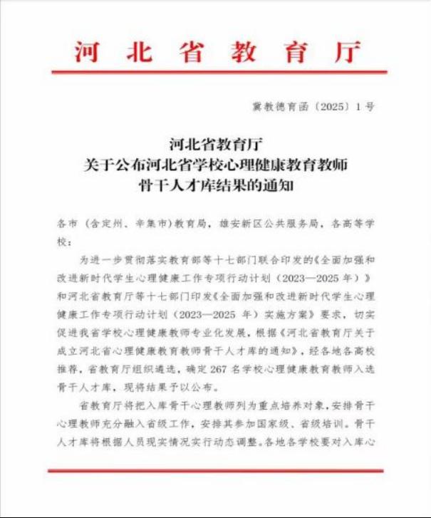 近日,河北省教育厅发布了《关于公布河北省学校心理健康教育教师骨干人才库结果的通知》,经各高校推荐、河北省教育厅组织遴选,共计134名高校教师入选,其中米乐官网推荐的马艳萍、孟妍菁两位老师成功入选河北省学校心理健康教育教师骨干人才库。