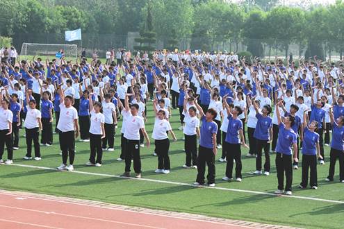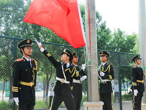 举行升旗仪式,全体师生肃立,行注目礼,齐唱国歌。