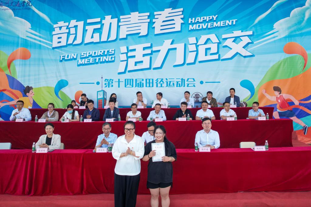 党委委员、党委宣传部部长杨婷婷为校田径运动会最高纪录奖获得者颁奖。