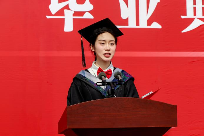 经济管理学院孙康宁作为学生代表向母校和全体师生表示感谢。她回顾大学成长,强调校训“进德修业,知行合一”的重要性,并表示将秉承校训精神,追求卓越。最后,她代表全体毕业生送上对母校和全体师生的祝福。