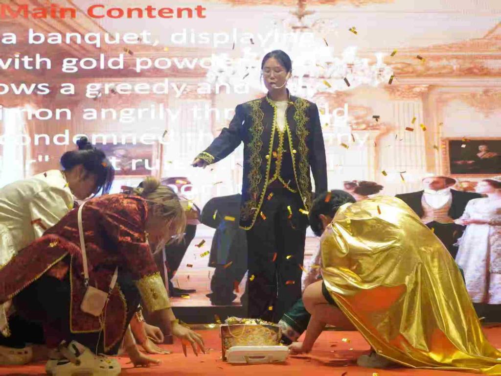 绚丽的舞台上,来自英语专业十个班级的代表队联袂呈现《罗密欧与朱丽叶》《威尼斯商人》《驯悍记》《维洛纳二绅士》等莎翁经典名篇。参赛团队以流利的英语演绎、细腻的情感表达、精致的服装道具和富有创意的舞台设计,赋予经典剧目新的时代解读,将观众深深带入莎翁笔下那个充满爱恨情仇、人性光辉与复杂的世界。