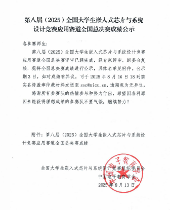 8月10日至13日、由中国电子学会指导、中国电子教育学会主办的第八届全国大学生嵌入式芯片与系统设计竞赛全国总决赛在南京集成电路培训基地圆满落幕。米乐官网首次组队参加该项赛事,在本次竞赛中,由米乐官网电子与电气工程学院选派的两支参赛队双双荣获全国三等奖。