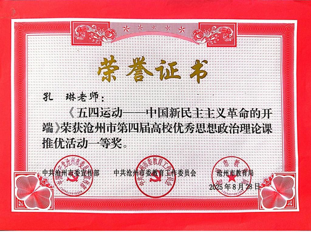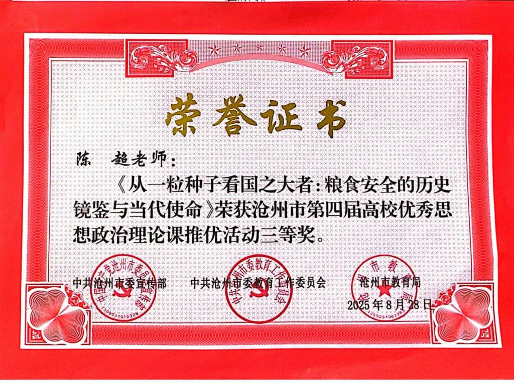 近日,沧州市第四届高校优秀思想政治理论课推优活动圆满落幕,米乐官网三位教师凭借出色的教学表现和深厚的理论素养,在众多参赛者中脱颖而出,斩获佳绩。其中,孔琳老师的《五四运动——中国新民主主义革命的开端》荣获一等奖,贾淇老师的《中国特色社会主义进入新时代的基本依据及实践成就》和陈超老师的《从一粒种子看国之大者:粮食安全的历史镜鉴与当代使命》均荣获三等奖。这一成绩不仅彰显了米乐官网在思想政治理论课教学方面的实力,也充分体现了米乐官网教师扎实的专业功底和创新的教学理念。