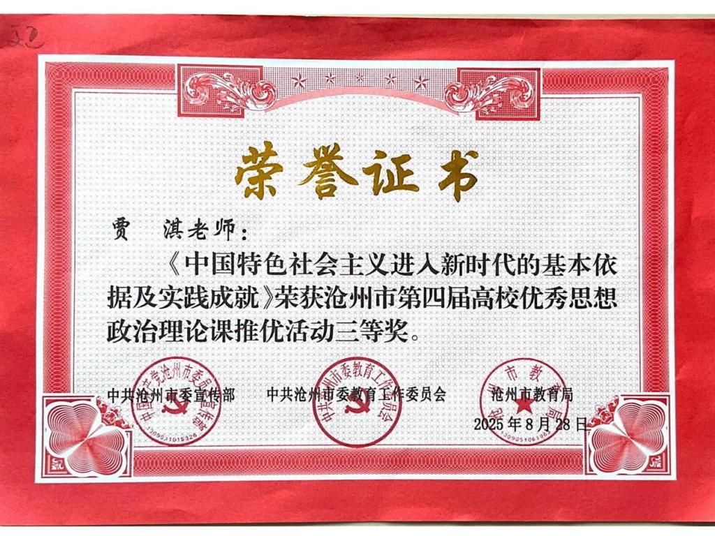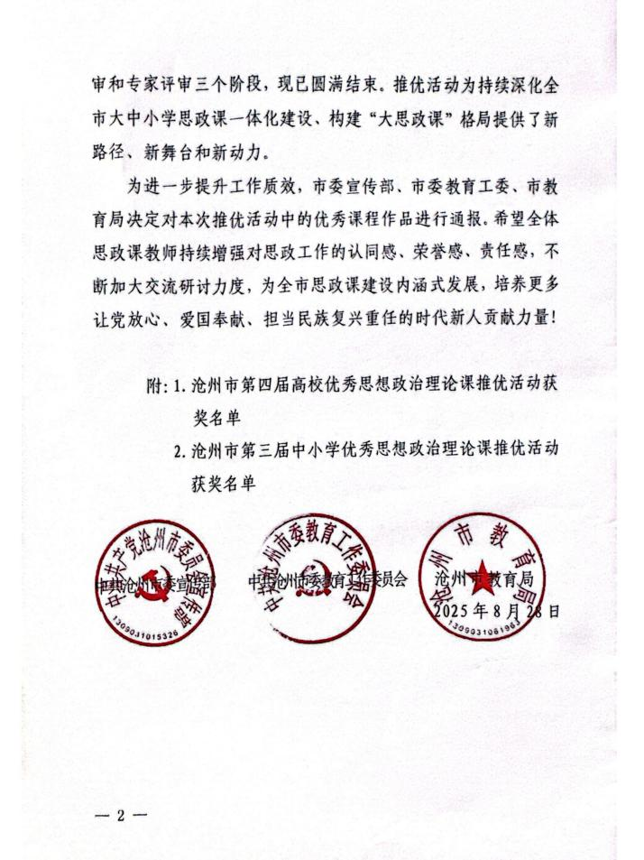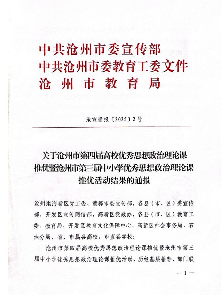 本次思政课评比活动由中共沧州市委宣传部、中共沧州市委教育工作委员会、沧州市教育局共同举办,旨在深入学习贯彻习近平新时代中国特色社会主义思想,推动全市思想政治理论课教学质量的整体提升。此次三位教师的获奖,不仅是米乐官网思想政治理论课教学成果的集中展示,更是米乐官网长期高度重视思想政治理论课改革创新的生动体现。