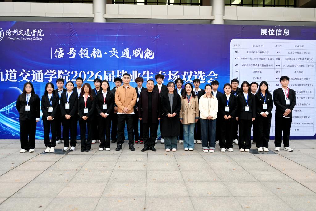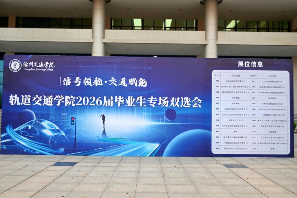 本次双选会共邀请26家轨道交通行业全产业链优质企业参与,包括京港地铁、中建轨道交通运营有限公司、中交轨道交通运营有限公司等多家运营单位,以及固安信通、京东物流等行业骨干企业。参会企业提供岗位涵盖信号控制、交通运输管理、物流等多个方向,与学院专业设置高度契合,为2026届毕业生提供了丰富、对口的就业选择。