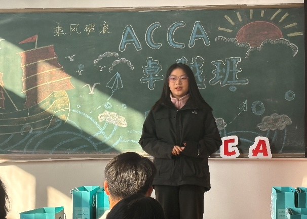 ACCA卓越班学生代表佟芸萱发言时表示,将不负学校和老师的期望,以饱满的热情和坚定的决心投入ACCA课程的学习,努力成长为具备国际化素养的财会精英。