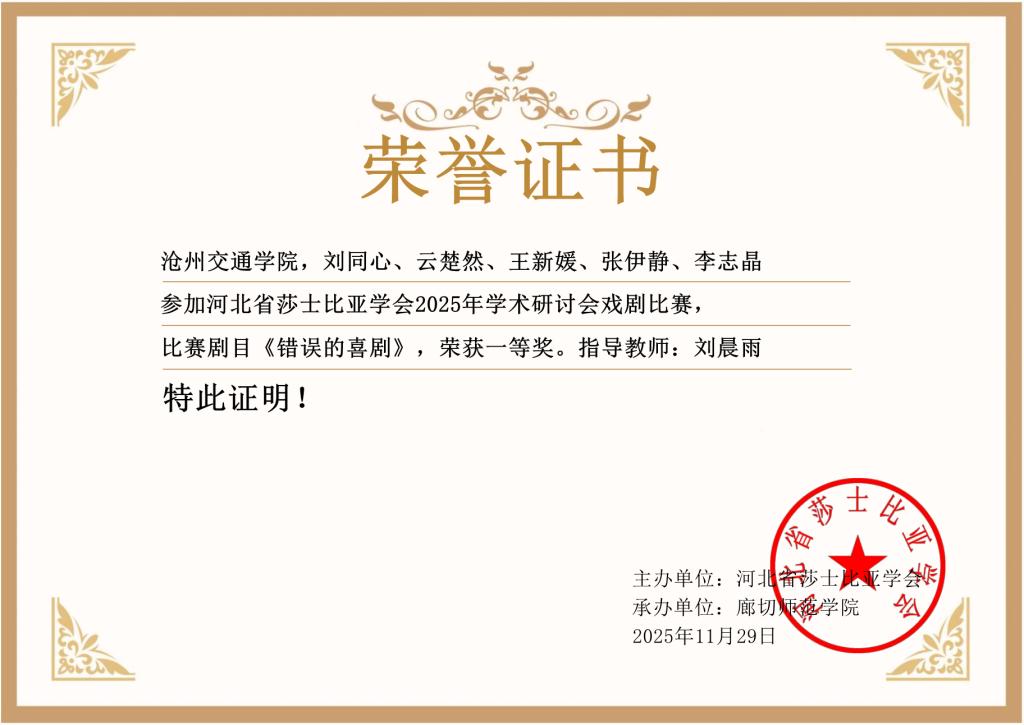 值得一提的是,该剧组此前已在河北省莎士比亚学会举办的2025年学术研讨会莎剧比赛中荣获一等奖,凭借流利标准的英文台词、富有感染力的肢体表达和细腻到位的情感诠释,赢得了省内外评审专家的一致赞誉,并被推荐参加本次全国性赛事。此次成功入围,既是对剧组师生连日来精心排练、刻苦打磨的充分肯定,也是学校践行“进德修业,知行合一”校训,深化外语教学实践育人与美育教育融合、打造外语品牌特色活动、丰富校园文化内涵的生动体现。