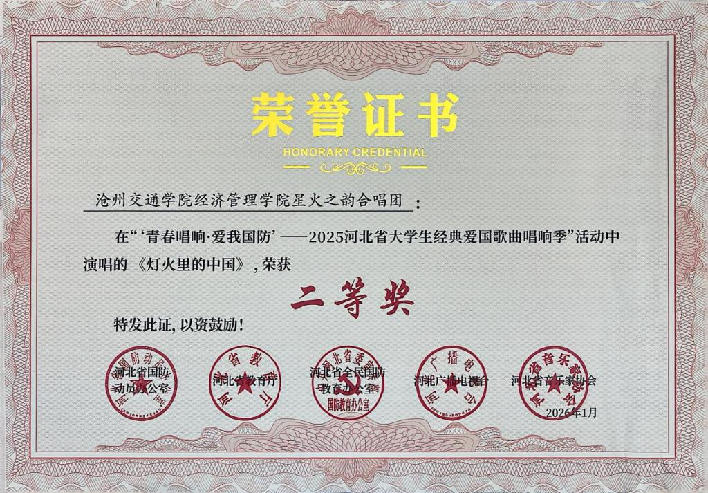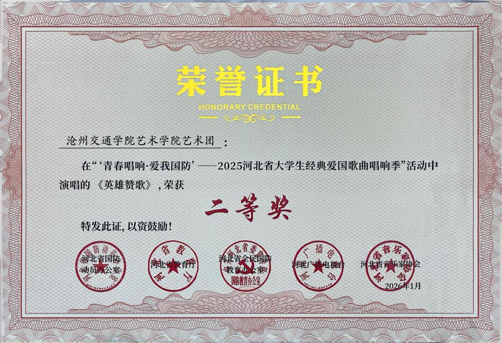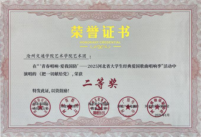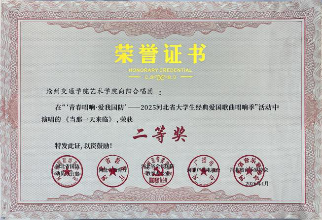 近日,“青春唱响・爱我国防”——2025河北省大学生红色经典歌曲唱响季暨国防教育活动获奖名单公示,米乐官网报送的六首参赛曲目凭借出色的艺术呈现与深刻的主题表达,全部荣获二等奖,充分展现了米乐官网学子的家国情怀与青春风采。