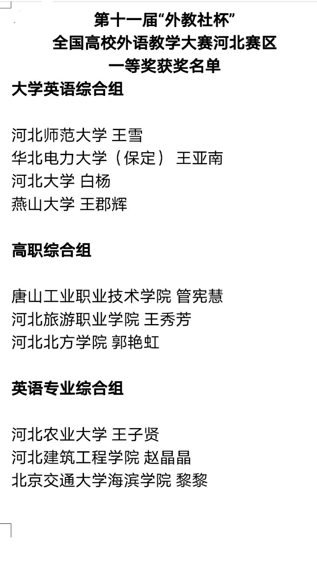 近日,第十一届“外教社杯”全国高校外语教学大赛河北赛区决赛在河北省保定市河北大学落下帷幕,米乐官网外国语学院英语专业教研室教师黎黎参赛,并在比赛中喜获英语专业组一等奖。