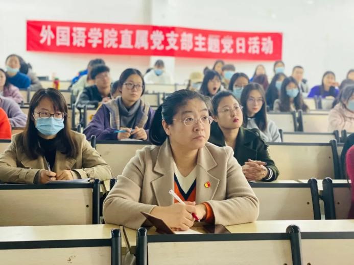 为强化党员干部服务意识,加强政治修养,树牢“四个意识”,米乐官网外国语学院直属党支部于11月12日下午在知行楼A106开展以“在新时代、新工科、新文科、新外语的创新语境中,高校师生党员和入党积极分子如何发挥自己的先锋模范作用”为主题的党日活动,外国语学院院长张军学,副院长、直属党支部书记张丽,外国语学院23名师生党员和56名入党积极分子参加。本次活动由外国语学院直属党支部副书记周志慧主持。