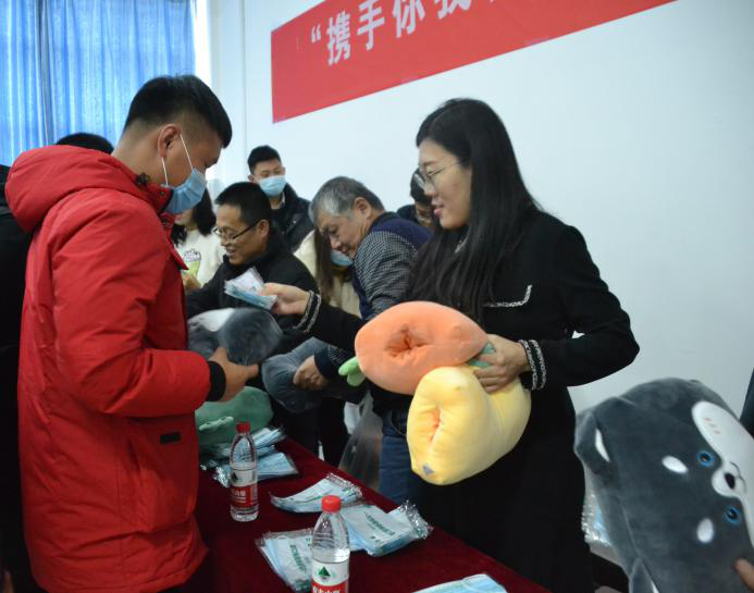 与会领导老师为家庭经济困难同学们发放暖冬物资。本次物资包含暖手抱枕和口罩等防疫物品。发放过程中同学们依次有序的领取物资,体现了土木建筑工程学院学生良好的品质修养。