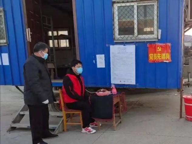 工程造价1904班学生张云飞工作在公交汽车站或村口防疫站点,负责控制人员进出、体温检测及所在地记录信息登记等工作。