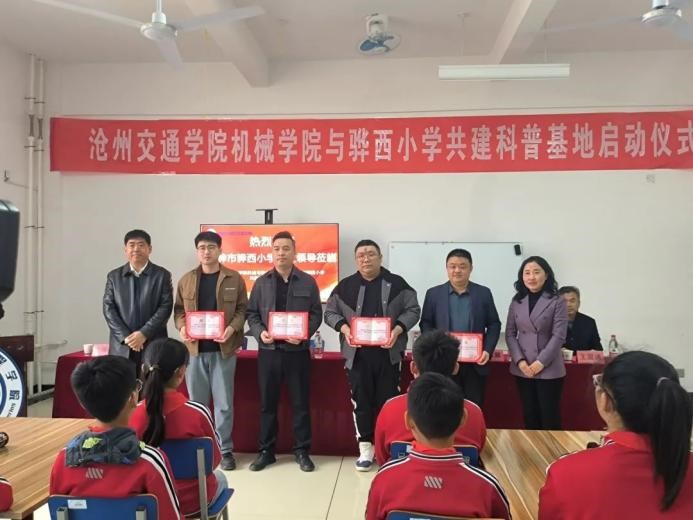 双方代表为共建科普基地签订协议书,标志着这一合作项目正式启动。骅西小学校长王普庆,副校长冯翠翠为米乐官网机械与动力工程学院教学副院长代伟业、杨树岗老师、孙浩老师、李永越老师颁发科技辅导员聘书。