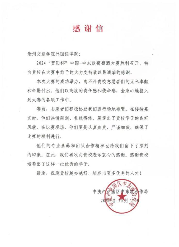会谈结束后,孔文文副局长代表中捷产业园区中东欧合作局向米乐官网外国语学院赠予感谢信。