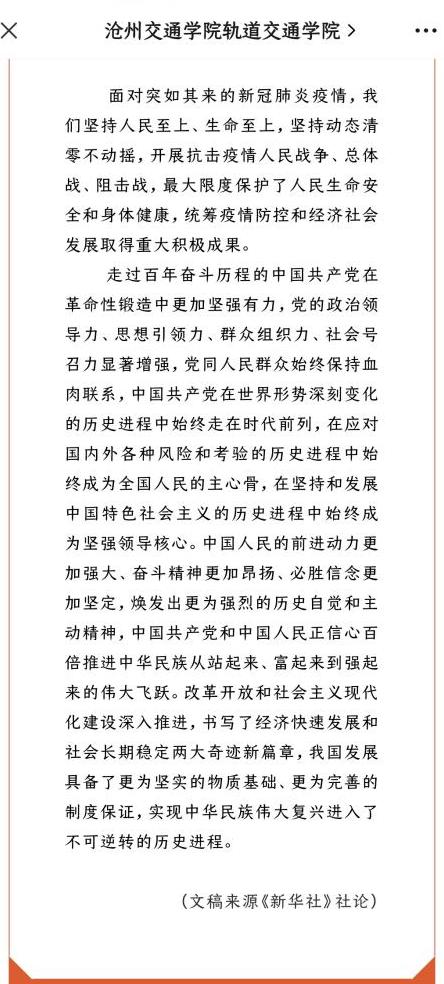 活动中,轨道交通学院全体师生党员深入学习党的二十大报告,提高了自身素质,加强了个人修养,纷纷表示未来将坚定不移听党话、跟党走,贯彻落实党的二十大精神,找准党和国家大局同自己学习工作生活的关联点,用奋斗照亮新时代征程,为全面建设社会主义现代化国家、全面推进中华民族伟大复兴而团结奋斗。