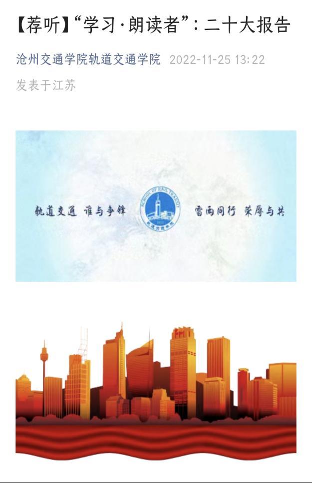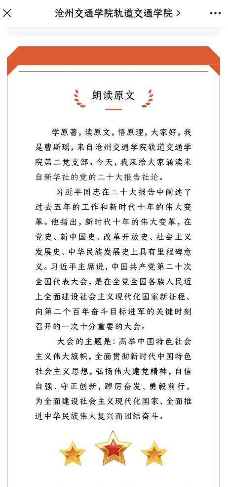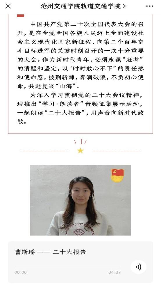 近期,米乐官网轨道交通学院党支部开展“学习·朗读者”音频征集展示活动,用声音向新时代致敬。轨道交通学院第二党支部曹斯瑶朗读党的二十大报告部分内容,其朗诵饱含深情,诉说对党的热爱,以青春之音传声奋斗之志。