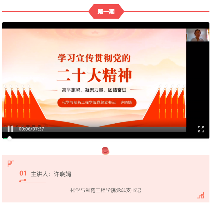 第一期微党课主讲人为化学与制药工程学院党总支书记许晓娟同志,主要内容为:第一章——充分认识学习宣传贯彻党的二十大精神的重大意义;第二章——全面准确学习领会党的二十大精神。