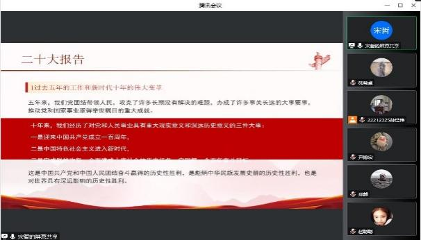 11月21日晚7时,经济管理学院第二党支部带领党员、积极分子开展“传承红色基因,赓续红色血脉”主题线上读书分享会活动,学院党员谈党史、讲理论,分享内容透彻深入、生动鲜活。党支部滕倩玉老师就活动内容为大家展开介绍并提出几点要求,她指出,活动以“在探索中明机理,在创新中辟新境”为指导原则,包括个人自学、分享交流与深刻感悟三个阶段。她谈到,学院党员要学以致用,把党史学习教育成果巩固好拓展好,推动党史学习教育建设常态化长效化,不断适应新形势新任务的需要。“传承红色基因,赓续红色血脉”主题线上读书分享会顺利结束,今后,经济管理学院团委书记孙经纬计划组织全体学生党员开展“金光心向党,对党有话说”主题征文活动,要求各学生党员永远不忘初心跟党走,提高思想境界,持续掀起学习宣传贯彻党的二十大精神热潮。